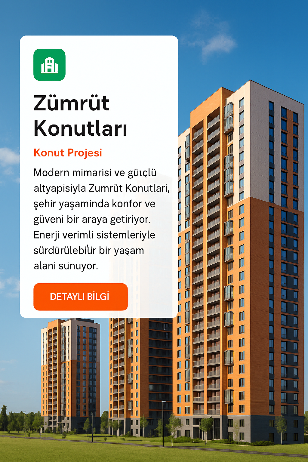 Modern mimarisi ve güçlü altyapısıyla Zümrüt Konutları, şehir yaşamında konfor ve güveni bir araya getiriyor. Enerji verimli sistemleriyle sürdürülebilir bir yaşam alanı sunuyo